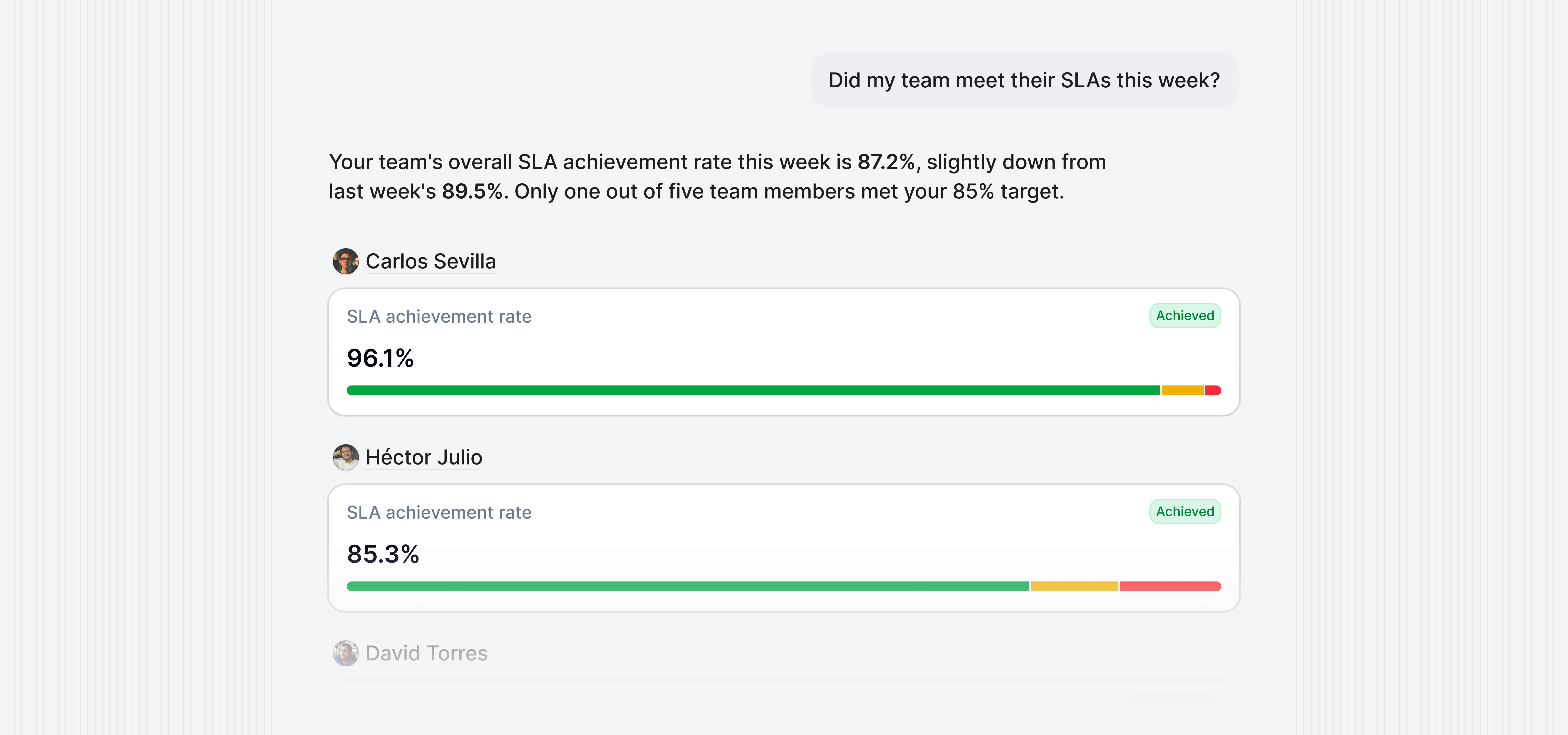 - Role-based access is enforced: query results respect your workspace role. Admins see data across the workspace, Managers only see data for their managed teams, and Viewers only see their own data. These restrictions are applied at the query level and can’t be bypassed through the chat interface.